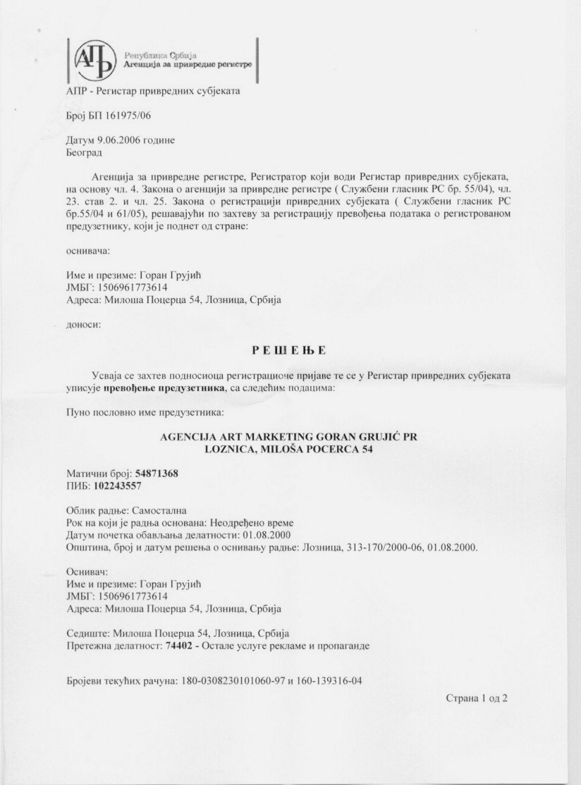Godine 1995. pridružuje mu se Goran Grujić, a njihova saradnja ubrzo rađa ideju o osnivanju zajedničke firme. Zvanično su je registrovali 2000. godine, a već 2003. uselili su se u novi poslovni prostor, koji je i danas dom njihove strasti prema savršenstvu u izradi svetlećih reklama.